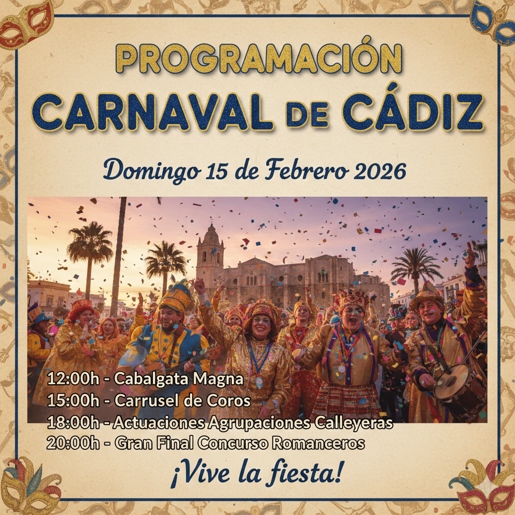 El Carnaval de Cádiz 2026 es una de las celebraciones más importantes de Andalucía y España, conocida mundialmente por su ingenio, humor y música. El Concurso Oficial de Agrupaciones Carnavalescas (COAC) reúne cada año a las mejores comparsas, chirigotas, coros y cuartetos en el emblemático Gran Teatro Falla.